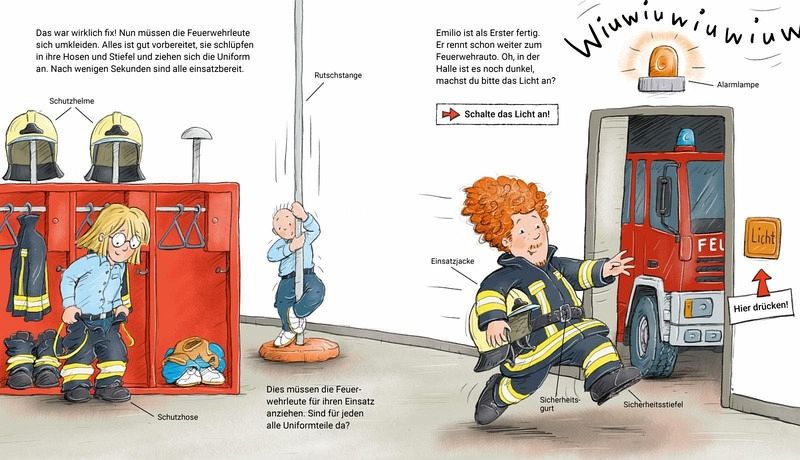 Drehen, pusten, klopfen - jede Seite fordert zum Mitmachen auf und erklärt dabei spielerisch den Alltag bei der Feuerwehr. Von der Leitstelle über Einsatzfahrzeuge bis zur Uniform: Kinder ab 3 Jahren entdecken wichtiges Feuerwehrwissen mit Spaß und Bewegung.
