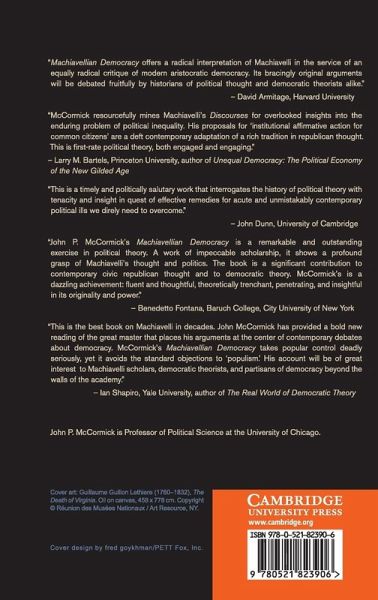 'John McCormick has ... offered a bold and compelling reading of an under-appreciated democratic strain in Machiavelli's thinking by highlighting the elite-controlling and citizen-empowering aspects of democratic institutions within Machiavelli's major writings. The book is an excellent work of scholarship that is sensitive to the nuances of the tradition in which Machiavelli was writing and the settled assumptions he sought to overturn.' Theory and Event