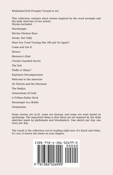 #Inktober2018 Prompts Turned to Art This collection contains short stories inspired by the word prompts and the daily sketches of two artists. Stories included:Machimagic Mecha-Chicken Race Sweet, Hot Taffy Have You Tried Turning Her Off and On Again? Come and Get It Hewoo Berenice's Hair Closely Guarded Secret The Veil Fluffy or Shiny? Explosive Decompression Welcome to the Asterism Sir Patrick and the Mermaid The Redjus Generations of Gold A Trillion-Dollar Rock Messenger in a Bottle Gorgoneion Some stories are sci-fi, some are fantasy, and some are even based on mythology. The important thing is that these are all inspired by the daily sketches made by philtomato and bloodsplach. One sketch per day, one story per day. The result is the collection you're reading right now. It's black and white, it's raw, it leaves ink stains on your fingers. WARNING: "Machimagic" is not suitable for children.