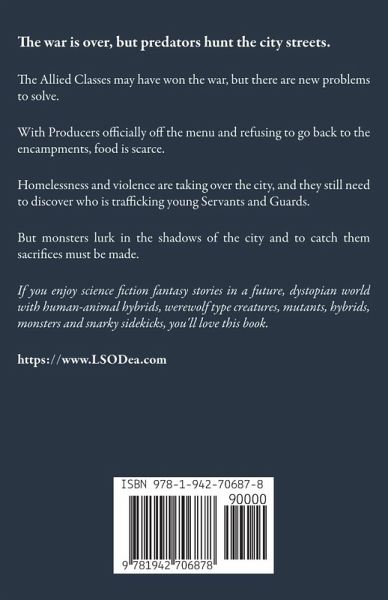 The war is over, but predators hunt the city streets. The Allied Classes may have won the war, but there are new problems to solve. With Producers officially off the menu and refusing to go back to the encampments, food is scarce. Homelessness and violence are taking over the city, and they still need to discover who is trafficking young Servants and Guards. But monsters lurk in the shadows of the city and to catch them sacrifices must be made. If you enjoy science fiction fantasy stories in a future, dystopian world with human-animal hybrids, werewolf type creatures, mutants, hybrids, monsters and snarky sidekicks, you'll love this book.