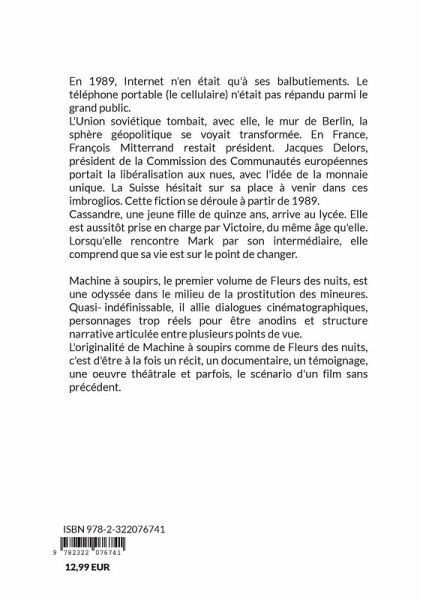 En 1989, Internet n'en était qu'à ses balbutiements. Le téléphone portable (le cellulaire) n'était pas répandu parmi le grand public. L'Union soviétique tombait, avec elle, le mur de Berlin, la sphère géopolitique se voyait transformée. En France, François Mitterrand restait président. Jacques Delors, président de la Commission des Communautés européennes portait la libéralisation aux nues, avec l'idée de la monnaie unique. La Suisse hésitait sur sa place à venir dans ces imbroglios. Cette fiction se déroule à partir de 1989.Cassandre, une jeune fille de quinze ans, arrive au lycée. Elle est aussitôt prise en charge par Victoire, du même âge qu'elle. Lorsqu'elle rencontre Mark par son intermédiaire, elle comprend que sa vie est sur le point de changer.Machine à soupirs, le premier volume de Fleurs des nuits, est une odyssée dans le milieu de la prostitution des mineures. Quasi-indéfinissable, il allie dialogues cinématographiques, personnages trop réels pour être anodins et structure narrative articulée entre plusieurs points de vue. L'originalité de Machine à soupirs comme de Fleurs des nuits, c'est d'être à la fois un récit, un documentaire, un témoignage, une oeuvre théâtrale et parfois, le scénario d'un film sans précédent.