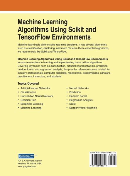 Machine learning is able to solve real-time problems. It has several algorithms such as classification, clustering, and more. To learn these essential algorithms, we require tools like Scikit and TensorFlow. Machine Learning Algorithms Using Scikit and TensorFlow Environments assists researchers in learning and implementing these critical algorithms. Covering key topics such as classification, artificial neural networks, prediction, random forest, and regression analysis, this premier reference source is ideal for industry professionals, computer scientists, researchers, academicians, scholars, practitioners, instructors, and students.