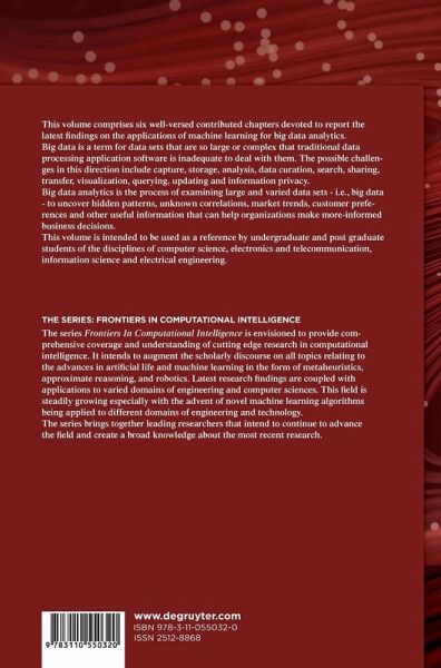 This volume comprises six well-versed contributed chapters devoted to report the latest fi ndings on the applications of machine learning for big data analytics. Big data is a term for data sets that are so large or complex that traditional data processing application software is inadequate to deal with them. The possible challenges in this direction include capture, storage, analysis, data curation, search, sharing, transfer, visualization, querying, updating and information privacy.
