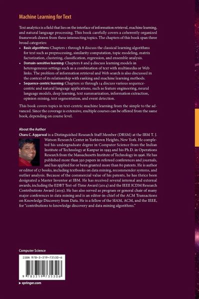 Text analytics is a field that lies on the interface of information retrieval,machine learning, and natural language processing, and this textbook carefully covers a coherently organized framework drawn from these intersecting topics. The chapters of this textbook is organized into three categories: