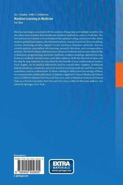 Machine learning is concerned with the analysis of large data and multiple variables. It is also often more sensitive than traditional statistical methods to analyze small data. The first and second volumes reviewed subjects like optimal scaling, neural networks, factor analysis, partial least squares, discriminant analysis, canonical analysis, fuzzy modeling, various clustering models, support vector machines, Bayesian networks, discrete wavelet analysis, association rule learning, anomaly detection, and correspondence analysis. This third volume addresses more advanced methods and includes subjects like evolutionary programming, stochastic methods, complex sampling, optional binning, Newton's methods, decision trees, and other subjects. Both the theoretical bases and the step by step analyses are described for the benefit of non-mathematical readers. Each chapter can be studied without the need to consult other chapters. Traditional statistical tests are, sometimes, priors to machine learning methods, and they are also, sometimes, used as contrast tests. To those wishing to obtain more knowledge of them, we recommend to additionally study (1) Statistics Applied to Clinical Studies 5th Edition 2012, (2) SPSS for Starters Part One and Two 2012, and (3) Statistical Analysis of Clinical Data on a Pocket Calculator Part One and Two 2012, written by the same authors, and edited by Springer, New York.