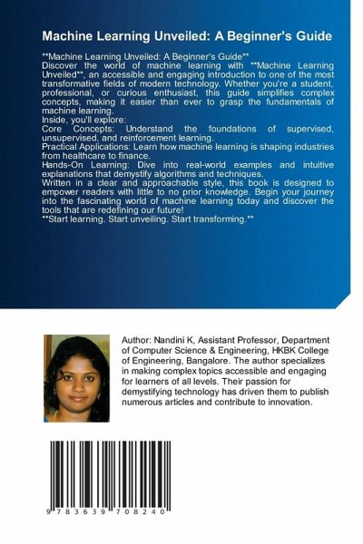 __Machine Learning Unveiled: A Beginner's Guide__ Discover the world of machine learning with __Machine Learning Unveiled__, an accessible and engaging introduction to one of the most transformative fields of modern technology. Whether you're a student, professional, or curious enthusiast, this guide simplifies complex concepts, making it easier than ever to grasp the fundamentals of machine learning. Inside, you'll explore: Core Concepts: Understand the foundations of supervised, unsupervised, and reinforcement learning. Practical Applications: Learn how machine learning is shaping industries from healthcare to finance. Hands-On Learning: Dive into real-world examples and intuitive explanations that demystify algorithms and techniques.Written in a clear and approachable style, this book is designed to empower readers with little to no prior knowledge. Begin your journey into the fascinating world of machine learning today and discover the tools that are redefining our future! __Start learning. Start unveiling. Start transforming.__