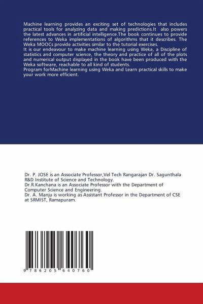 Machine learning provides an exciting set of technologies that includes practical tools for analyzing data and making predictions.It also powers the latest advances in artificial intelligence.The book continues to provide references to Weka implementations of algorithms that it describes. The Weka MOOCs provide activities similar to the tutorial exercises.It is our endeavour to make machine learning using Weka, a Discipline of statistics and computer science, the theory and practice of all of the plots and numerical output displayed in the book have been produced with the Weka software, reachable to all kind of students. Program forMachine learning using Weka and Learn practical skills to make your work more efficient.