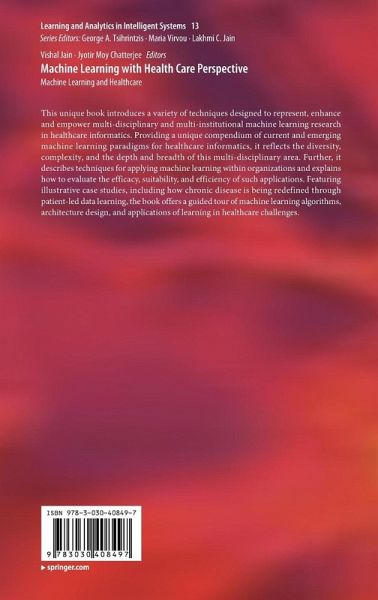 Chapter 1: Machine learning for Healthcare: Introduction.- Chapter 2: Artificial Intelligence in Medical Diagnosis: Methods, algorithms and applications.- Chapter 3: Intelligent Learning Analytics in Healthcare Sector Using Machine Learning.- Chapter 4: Unsupervised Learning on Healthcare Survey Data with Particle Swarm Optimization.- Chapter 5: Machine Learning for Healthcare Diagnostics.- Chapter 6: Disease Detection System (DDS) Using Machine Learning Technique.- Chapter 7: Knowledge Discovery (Feature Identification) from Teeth, Wrist and Femur Images to determine Human Age and Gender.- Chapter 8: Deep Learning Solutions for Skin Cancer Detection and Diagnosis.- Chapter 9: Security of Healthcare Systems with Smart Health Records using Cloud Technology.- Chapter 10: Intelligent Heart Disease Prediction on Physical and Mental Parameters: A ML Based IoT and Big Data Application and Analysis.- Chapter 11: Medical Text and image processing: Applications, issues and challenges.- Chapter12: Machine Learning Methods for Managing Parkinson's Disease.- Chapter 13: An Efficient Method for Computer-aided Diagnosis of Cardiac Arrhythmias.- Chapter 14: Clinical decision support systems and predictive analytics.- Chapter 15: Yajna and Mantra Science Bringing Health and Comfort to Indo-Asian Public: A Healthcare 4.0 Approach and Computational Study.- Chapter 16: Identifying Diseases and Diagnosis using Machine Learning.