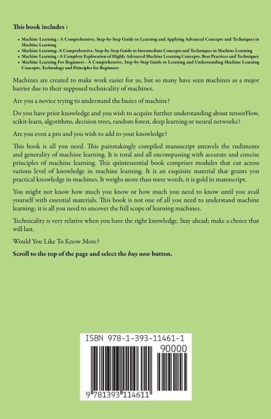 This book includes :Machine Learning : A Complete Exploration of Highly Advanced Machine Learning Concepts, Best Practices and Techniques Machine Learning: A Comprehensive, Step-by-Step Guide to Intermediate Concepts and Techniques in Machine Learning Machine Learning : A Comprehensive, Step-by-Step Guide to Learning and Applying Advanced Concepts and Techniques in Machine Learning Machine Learning For Beginners : A Comprehensive, Step-by-Step Guide to Learning and Understanding Machine Learning Concepts, Technology and Principles for Beginners Machines are created to make work easier for us, but so many have seen machines as a major barrier due to their supposed technicality of machines. Are you a novice trying to understand the basics of machine? Do you have prior knowledge and you wish to acquire further understanding about tensorFlow, scikit-learn, algorithms, decision trees, random forest, deep learning or neural networks? Are you even a pro and you wish to add to your knowledge? This book is all you need. This painstakingly compiled manuscript unravels the rudiments and generality of machine learning. It is total and all encompassing with accurate and concise principles of machine learning. This quintessential book comprises modules that cut across various level of knowledge in machine learning. It is an exquisite material that grants you practical knowledge in machines. It weighs more than mere words, it is gold in manuscript. You might not know how much you know or how much you need to know until you avail yourself with essential materials. This book is not one of all you need to understand machine learning; it is all you need to uncover the full scope of learning machines. Technicality is very relative when you have the right knowledge. Stay ahead; make a choice that will last. Would You Like To Know More? Scroll to the top of the page and select the buy now button.