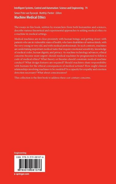 The essays in this book, written by researchers from both humanities and science, describe various theoretical and experimental approaches to adding medical ethics to a machine, what design features are necessary in order to achieve this, philosophical and practical questions concerning justice, rights, decision-making and responsibility in medical contexts, and accurately modeling essential physician-machine-patient relationships.