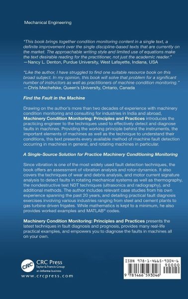 Find the Fault in the Machines Drawing on the author's more than two decades of experience with machinery condition monitoring and consulting for industries in India and abroad, Machinery Condition Monitoring: Principles and Practices introduces the practicing engineer to the techniques used to effectively detect and diagnose faults in machines. Providing the working principle behind the instruments, the important elements of machines as well as the technique to understand their conditions, this text presents every available method of machine fault detection occurring in machines in general, and rotating machines in particular. A Single-Source Solution for Practice Machinery Conditioning Monitoring Since vibration is one of the most widely used fault detection techniques, the book offers an assessment of vibration analysis and rotor-dynamics. It also covers the techniques of wear and debris analysis, and motor current signature analysis to detect faults in rotating mechanical systems as well as thermography, the nondestructive test NDT techniques (ultrasonics and radiography), and additional methods. The author includes relevant case studies from his own experience spanning over the past 20 years, and detailing practical fault diagnosis exercises involving various industries ranging from steel and cement plants to gas turbine driven frigates. While mathematics is kept to a minimum, he also provides worked examples and MATLAB(R) codes. This book contains 15 chapters and provides topical information that includes: * A brief overview of the maintenance techniques * Fundamentals of machinery vibration and rotor dynamics * Basics of signal processing and instrumentation, which are essential for monitoring the health of machines * Requirements of vibration monitoring and noise monitoring * Electrical machinery faults * Thermography for condition monitoring * Techniques of wear debris analysis and some of the nondestructive test (NDT) techniques for condition monitoring like ultrasonics and radiography * Machine tool condition monitoring * Engineering failure analysis * Several case studies, mostly on failure analysis, from the author's consulting experience Machinery Condition Monitoring: Principles and Practices presents the latest techniques in fault diagnosis and prognosis, provides many real-life practical examples, and empowers you to diagnose the faults in machines all on your own.