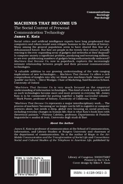 Social critics and artificial intelligence experts have long prophesized that computers and robots would soon relegate humans to the dustbin of history. Many among the general population seem to have shared this fear of a dehumanized future. But how are people in the twenty-first century actually reacting to the ever-expanding array of gadgets and networks at their disposal? Is computer anxiety a significant problem, paralyzing and terrorizing millions, or are ever-proliferating numbers of gadgets being enthusiastically embraced? Machines that Become Us explores the increasingly intimate relationship between people and their personal communication technologies.In the first book of its kind, internationally recognized scholars from the United States and Europe explore this topic. Among the technologies analyzed include the Internet, personal digital assistants (PDAs), mobile phones, networked homes, "smart" fabrics and wearable computers, interactive location badges, and implanted monitoring devices. The authors discuss critical policy issues, such as the problems of information resource access and equity, and the recently discovered "digital dropouts" phenomena.The use of the word "become" in the book's title has three different meanings. The first suggests how people use these technologies to broaden their abilities to communicate and to represent themselves to others. Thus the technologies "become" extensions and representatives of the communicators. A second sense of "become" applies to analysis of the way these technologies become physically integrated with the user's clothing and even their bodies. Finally, contributors examine fashion aspects and uses of these technologies, that is, how they are used in ways becoming to the wearer. The conclusions of many chapters are supported by data, including ethnographic observations, attitude surveys and case studies from the United States, Britain, France, Italy, Finland, and Norway. This approach is especially valuable given the dearth of empirical studies in a field that has been traditionally dominated by extrapolation and speculation, and that has focused on possible future states rather than analysis of current situations. Other chapters are integrative, seeking to advance emerging theoretical perspectives.This exciting volume generates new insights concerning the burgeoning electronic confusion that increasingly penetrates and blurs the boundaries of various spheres of life in modern society. Machines That Become Us will be of interest to students of communications and technology, sociologists, and social psychologists.