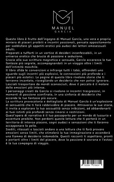 Questo libro nasce da un'idea di Manuel García, una vera e propria miniera di piaceri proibiti e incontri passionali, pensata appositamente per soddisfare gli appetiti erotici più audaci dei lettori adulti omosessuali.Preparatevi a tuffarvi in un vortice di desideri inconfessabili, in un universo erotico che brucia di passione e seduzione. Grazie alla sua scrittura magnetica e sensuale, García accarezza le vostre fantasie più segrete, accompagnandovi in un viaggio oltre i limiti dell'intimità maschile.Il libro sfida le convenzioni e infrange tutti i tabù, offrendo uno sguardo agli incontri più esplosivi, ai legami più profondi e ai piaceri più estatici. Le pagine di questo libro rivelano storie che vi terranno incantati, risvegliando un desiderio che non potrete ignorare.Lasciatevi trasportare da mondi sconosciuti, dove il peccato è il motore delle emozioni più intense. I personaggi creati da García si rivelano in incontri trasgressivi, in momenti di passione sconfinata, in una sinfonia di desiderio che accende le vostre fantasie più oscure.La scrittura provocatoria e dettagliata di Manuel García è un'esplosione di sensualità che vi farà rabbrividire di piacere. Attraverso le sue storie, vi invita a esplorare la vostra sessualità senza inibizioni, ad abbandonarvi ai vostri istinti più profondi senza rimorsi o restrizioni.Quest'opera di narrativa è il vostro passaporto per un mondo di lussuria e avventure proibite. Non perdetevi questa lettura che vi porterà in un territorio di piacere intenso, sogni audaci e sensazioni che vi faranno accapponare la pelle.Sedetevi, rilassatevi e lasciatevi andare a una lettura che vi farà provare emozioni senza limiti, che stimolerà la vostra immaginazione e accenderà una fiamma di desiderio indomabile. Questi racconti vi aspettano, pronti a portarvi oltre i limiti del piacere, dove la passione è sovrana e l'estasi è la vostra compagna di viaggio.