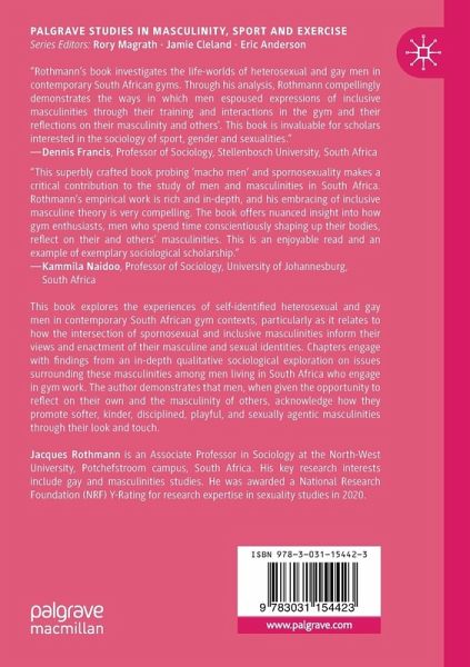 This book explores the experiences of self-identified heterosexual and gay men in contemporary South African gym contexts, particularly as it relates to how the intersection of spornosexual and inclusive masculinities inform their views and enactment of their masculine and sexual identities. Chapters engage with findings from an in-depth qualitative sociological exploration on issues surrounding these masculinities among men living in South Africa who engage in gym work. The author demonstrates that men, when given the opportunity to reflect on their own and the masculinity of others, acknowledge how they promote softer, kinder, disciplined, playful, and sexually agentic masculinities through their look and touch.