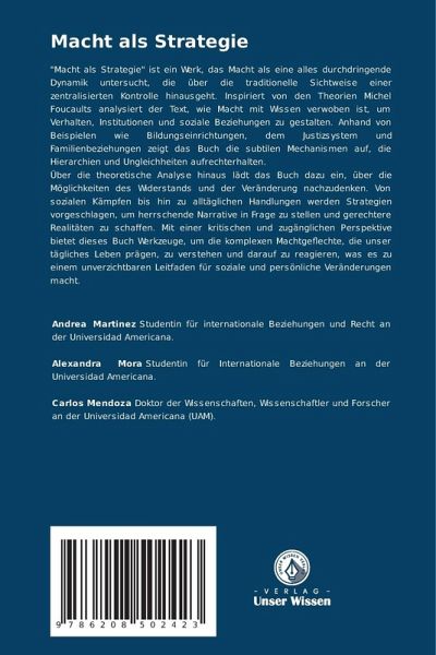 "Macht als Strategie" ist ein Werk, das Macht als eine alles durchdringende Dynamik untersucht, die über die traditionelle Sichtweise einer zentralisierten Kontrolle hinausgeht. Inspiriert von den Theorien Michel Foucaults analysiert der Text, wie Macht mit Wissen verwoben ist, um Verhalten, Institutionen und soziale Beziehungen zu gestalten. Anhand von Beispielen wie Bildungseinrichtungen, dem Justizsystem und Familienbeziehungen zeigt das Buch die subtilen Mechanismen auf, die Hierarchien und Ungleichheiten aufrechterhalten.Über die theoretische Analyse hinaus lädt das Buch dazu ein, über die Möglichkeiten des Widerstands und der Veränderung nachzudenken. Von sozialen Kämpfen bis hin zu alltäglichen Handlungen werden Strategien vorgeschlagen, um herrschende Narrative in Frage zu stellen und gerechtere Realitäten zu schaffen. Mit einer kritischen und zugänglichen Perspektive bietet dieses Buch Werkzeuge, um die komplexen Machtgeflechte, die unser tägliches Leben prägen, zu verstehen und darauf zu reagieren, was es zu einem unverzichtbaren Leitfaden für soziale und persönliche Veränderungen macht.
