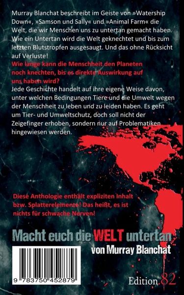 In der Anthologie »Macht euch die Welt untertan« beschreibt Murray Blanchat im Geiste von »Watership Down«, »Samson und Sally« und »Animal Farm« die Welt, die wir Menschen uns zu untertan gemacht haben. Wie ein Untertan wird die Welt geknechtet und bis zum letzten Blutstropfen ausgesaugt. Und das ohne Rücksicht auf Verluste!Wie lange kann die Menschheit den Planeten noch knechten, bis es direkte Auswirkung auf uns haben wird?Jede Geschichte handelt auf ihre eigene Weise davon, unter welchen Bedingungen Tiere und die Umwelt wegen der Menschheit zu leben und zu leiden haben. Es geht um Tier- und Umweltschutz, doch soll nicht der Zeigefinger erhoben, sondern nur auf Problematiken hingewiesen werden.