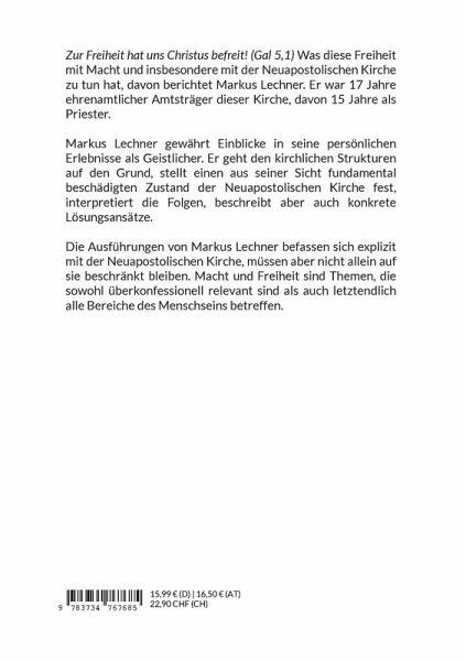 Zur Freiheit hat uns Christus befreit! (Gal 5,1) Was diese Freiheitmit Macht und insbesondere mit der Neuapostolischen Kirchezu tun hat, davon berichtet Markus Lechner. Er war 17 Jahreehrenamtlicher Amtsträger dieser Kirche, davon 15 Jahre alsPriester.Markus Lechner gewährt Einblicke in seine persönlichenErlebnisse als Geistlicher. Er geht den kirchlichen Strukturenauf den Grund, stellt einen aus seiner Sicht fundamentalbeschädigten Zustand der Neuapostolischen Kirche fest,interpretiert die Folgen, beschreibt aber auch konkreteLösungsansätze.Die Ausführungen von Markus Lechner befassen sich explizitmit der Neuapostolischen Kirche, müssen aber nicht allein aufsie beschränkt bleiben. Macht und Freiheit sind Themen, diesowohl überkonfessionell relevant sind als auch letztendlichalle Bereiche des Menschseins betreffen.