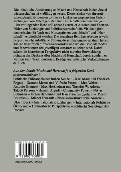 Macht und Herrschaft in der Diskussion.- Gottes Gnade - Bürgers Recht. Macht und Herrschaft in der politischen Philosophie der Neuzeit.- Vom Traum zum Bewußtsein einer Sache gelangen - Analyse und Kritik von Macht und Herrschaft durch Karl Marx und Friedrich Engels.- Die Entdeckung der Eliten - Gaetano Mosca und Vilfredo Pareto über Macht und Herrschaft.- Max Weber: Amorphe Macht und Herrschaftsgehäuse.- Löwe und Fuchs. Antonio Gramscis Beitrag zu einer kritischen Theorie bürgerlicher Herrschaft.- 'Nicht bei sich selber zu Hause sein'. Horkheimer und Adorno über Macht und Herrschaft.- 'Macht' in den Schriften von Talcott Parsons.- Machtstrukturen in der Gemeinde: Alte Theorien - Neue Befunde.- Die Eigensinnigkeit des Politischen. Hannah Arendt über Macht und Herrschaft.- Mächtige Kommunikation in Niklas Luhmanns Theorie sozialer Systeme.- Die Zweideutigkeit der Demokratie. Zur Macht- und Herrschaftsproblematik bei Jürgen Habermas und Jean-François Lyotard.- Pierre Bourdieu: Das Schweigen der Doxa aufbrechen.- Die Analytik der Macht bei Michel Foucault.- Macht und Herrschaft in der 'Risikogesellschaft'.- Von Klassen und Schichten zu sozialen Lagen, Milieus und Lebensstilen - Von der Machtversessenheit zur Machtvergessenheit?.- Machtdiskurs und Herrschaftskritik im Feminismus.- Macht und Herrschaft in Theorien der Internationalen Beziehungen.- Macht-, Herrschafts- und Gesellschaftsverhältnisse in der kapitalistischen Globalisierung.- Herrschaftsfrei und grenzenlos? Eine Politische Soziologie des Internet.- Autorinnen und Autoren.