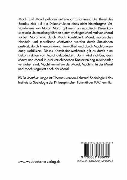 Macht und Moral gehören untrennbar zusammen. Die These des Bandes zielt auf die Dekonstruktion eines nicht hinterfragten Verständnisses von Moral: Moral gilt meist als moralisch. Diese konsensuelle Unterstellung führt an einem wichtigen Merkmal von Moral vorbei: Moral wird durch Macht konstituiert. Moral, moralisches Handeln und moralische Motivation werden durch Sanktionen gestützt, durch Internalisierung kontrolliert und durch Machtanwendung stabilisiert. Dieses Konstitutionsverhältnis gilt es durch eine Dekonstruktion von Moral aufzudecken. Dann wird sichtbar, dass Macht und Moral in drei verschiedenen Kontexten eng miteinander verwoben sind: Macht kommt vor der Moral, Macht ist in der Moral und Macht reguliert nach der Moral.