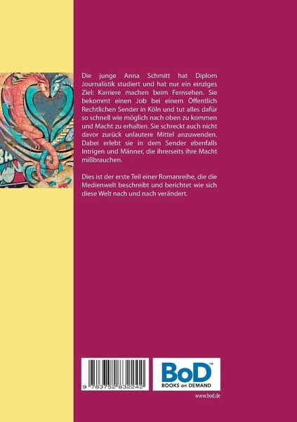 Die junge Anna Schmitt hat Diplom Journalistik studiert und hat nur ein einziges Ziel: Karriere machen beim Fernsehen. Sie bekommt einen Job bei einem Öffentlich Rechtlichen Sender in Köln und tut alles dafür so schnell wie möglich nach oben zu kommen und Macht zu erhalten. Sie schreckt auch nicht davor zurück unlautere Mittel anzuwenden. Dabei erlebt sie in dem Sender ebenfalls Intrigen und Männer, die ihrerseits ihre Macht mißbrauchen. Dies ist der erste Teil einer Romanreihe, die die Medienwelt beschreibt und berichtet wie sich diese Welt nach und nach verändert.Der Illustrator:Chad Lieber ist Music Producer, Artist und Tech Nerd. Er lebt in New York. Unter seinem Künstlernamen Pimptronot produziert er Mix Medium Kunst.