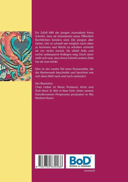 Ein Zufall hilft der jungen Journalistin Anna Schmitt, dass sie Intendantin eines Öffentlich Rechtlichen Senders wird. Die jüngste aller Zeiten. Um so schnell wie möglich nach oben zu kommen und Macht zu erhalten schreckt sie vor nichts zurück. Sie säbelt links und rechts unbequeme Kollegen weg. Doch dann stellt sich raus, dass Anna Schmitt andere Ziele hat als man denkt. Dies ist der zweite Teil einer Romanreihe, die die Medienwelt beschreibt und berichtet wie sich diese Welt nach und nach verändert.Der Illustrator:Chad Lieber ist Music Producer, Artist und Tech Nerd. Er lebt in New York. Unter seinem Künstlernamen Pimptronot produziert er Mix Medium Kunst.