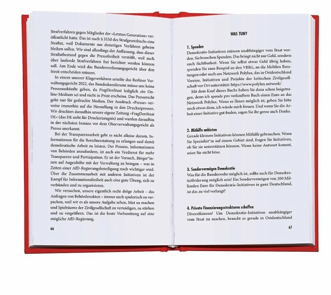 Generalstreiks, Streikpartnerschaften und politische Streiks,Möglichkeiten, um rechte Richter in der Justiz transparenter zu machen,ein AfD-Verbot,die Vorteile eines Demokratiefördergesetzes,das Remonstrationsrecht, das besagt, dass Beamte rechtswidrigen Befehlen nicht gehorchen dürfen,was eine Änderung des Wahlrechts bewirken könnte,das Leaken von Informationen und Whistleblowing,ein "Sondervermögen Demokratie",wie solidarisches Prepping aussehen kann,warum Faschisten aus Talkshows ausgeladen werden sollten undwarum wir eine neu definierte Brandmauer nach rechts brauchen.