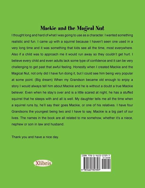 Mackie and the Magical Nut I thought long and hard of what I was going to use as a character. I wanted something realistic and fun. I came up with a squirrel because I havent seen one used in a very long time and it was something that kids see all the time, most everywhere. Also if a child was to approach ne, it would run away so they couldnt get hurt. I believe every child and even adults lack some type of confidence and it can be very challenging to get past that awful feeling. Honestly when I created Mackie and the Magical Nut, not only did I have fun doing it, but I could see him being very popular at some point. (Big dream) When my Grandson became old enough to enjoy a story I would always tell him about Mackie and he is without a doubt a true Mackie believer. Even when he stays over and is a little scared at night, he has a stuffed squirrel that he sleeps with and all is well. My daughter tells me all the time when a squirrel runs by, hell say their goes Mackie, or one of his relatives. I have four Grandsons the youngest being two and I have to say, Mackie is a big part of our lives. The names in the book are all related to me somehow, whether its a niece, nephew or son in law and husband. Thank you and have a nice day.