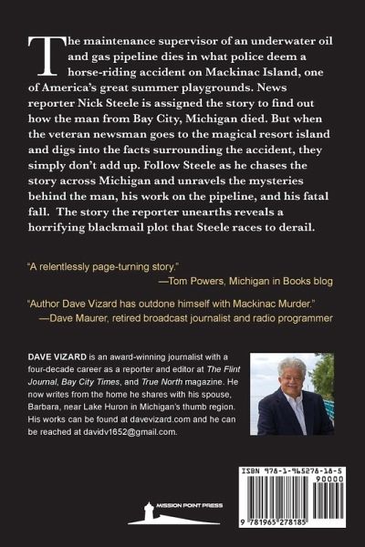 The maintenance supervisor of an underwater oil and gas pipeline dies in what police deem a horse-riding accident on Mackinac Island, one of America's great summer playgrounds. News reporter Nick Steele is assigned the story to find out how the man from Bay City, Michigan died. But when the veteran newsman goes to the magical resort island and digs into the facts surrounding the accident, they simply don't add up. Follow Steele as he chases the story across Michigan and unravels the mysteries behind the man, his work on the pipeline, and his fatal fall. The story the reporter unearths reveals a horrifying blackmail plot that Steele races to derail.