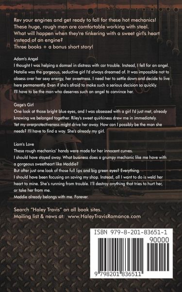 Rev your engines and get ready to fall for these hot mechanics! These huge, rough men are comfortable working with steel. What will happen when they're tinkering with a sweet girl's heart instead of an engine? You'll love these "high heat & sweet" romances full of adorable moments, instalove, and happily ever afters. Three books + a bonus short story! Adam's Angel I thought I was helping a damsel in distress with car trouble. Instead, I fell for an angel. Natalie's unexpected stop in Mackton changed my life. She was the gorgeous, seductive girl I'd always dreamed of. It was impossible not to obsess over her sexy energy, her sweetness. I need her to settle down and decide to live here permanently. Even if she's afraid to make such a serious decision so quickly. Even if her domineering father has other ideas. I'll have to be the man who deserves such an angel to convince her. Gage's Girl One look at those bright blue eyes, and I was obsessed with a girl I'd just met, already knowing we belonged together. Riley's sweet quirkiness drew me in immediately. I needed her with me so that I could keep her safe. The world is too dangerous for such a delicate girl all alone. Yet my overprotectiveness might drive her away. How can I possibly be the man she needs? I'll have to find a way. She's already my girl. Liam's Love These rough mechanics' hands were made for her innocent curves. I should have stayed away. What business does a grumpy mechanic like me have with a gorgeous sweetheart like Maddie? But after just one look of those full lips and big green eyes? Everything. I should have been focusing on saving my shop. Instead, all I want to do is weld her heart to mine. She's running from trouble. I'll destroy anything that tries to hurt her, or take her from me. Maddie already belongs with me. Forever. *** Mailing list & news at www.haleytravisromance.com