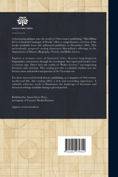 A fascinating glimpse into the world of 19th-century publishing, "MacMillan & Co.'s General Catalogue of Works" offers a comprehensive overview of the books available from this influential publisher in December 1869. This meticulously prepared catalog showcases Macmillan's offerings in the departments of History, Biography, Travels, and Belles Lettres. Explore a treasure trove of historical titles, discover long-forgotten biographies, and journey through the travelogues that captivated readers over a century ago. Delve into the realm of "Belles Lettres," encompassing literature and criticism. This catalog provides a valuable window into the literary tastes and intellectual pursuits of the Victorian era. For those interested in book history, publishing, or a snapshot of 19th-century intellectual life, this catalog offers a rich and rewarding experience. A valuable reference work, it illuminates the landscape of literature and historical writings available during a pivotal period. This work has been selected by scholars as being culturally important, and is part of the knowledge base of civilization as we know it. This work is in the public domain in the United States of America, and possibly other nations. Within the United States, you may freely copy and distribute this work, as no entity (individual or corporate) has a copyright on the body of the work. Scholars believe, and we concur, that this work is important enough to be preserved, reproduced, and made generally available to the public. We appreciate your support of the preservation process, and thank you for being an important part of keeping this knowledge alive and relevant.