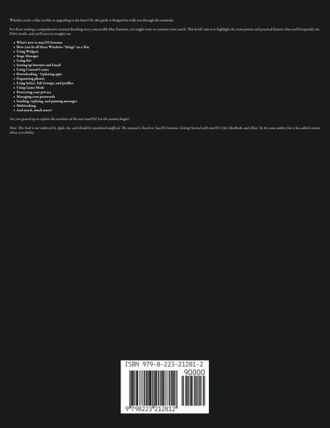Whether you're a Mac newbie or upgrading to the latest OS, this guide is designed to walk you through the essentials. For those seeking a comprehensive manual detailing every conceivable Mac function, you might want to continue your search. This book's aim is to highlight the most potent and practical features that you'll frequently use. Delve inside, and you'll uncover insights on:What's new to macOS Sonoma How you do all those Windows "things" on a Mac Using Widgets Stage Manager Using Siri Setting up Internet and Email Using Control Center Downloading / Updating apps Organizing photos Using Safari, Tab Groups, and profiles Using Game Mode Protecting your privacy Managing your passwords Sending, replying, and pinning messages Multitasking And much, much more! Are you geared up to explore the novelties of the new macOS? Let the journey begin! Note: This book is not endorsed by Apple, Inc. and should be considered unofficial. The manual is based on "macOS Sonoma: Getting Started with macOS 14 for MacBooks and iMacs" by the same author, but it has added content about accessibility.