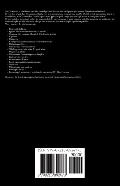 MacOS Ventura va transformer votre Mac en quelque chose d'encore plus intelligent et plus puissant. Mais comment l'utiliser ? Si vous êtes investi dans l'écosystème d'Apple, vous avez probablement remarqué que macOS, iPadOS et iOS commencent tous à se ressembler un peu. Cela contribue à rendre le processus d'apprentissage de chaque système d'exploitation beaucoup plus intuitif. Si vous souhaitez apprendre à utiliser les fonctionnalités les plus puissantes, ce guide vous sera utile. Il se concentre sur les éléments qui comptent le plus pour les utilisateurs, afin que vous puissiez être opérationnel le plus rapidement possible. Vous y trouverez des informations sur :Nouveautés de l'iMac Quelles sont les nouveautés de macOS Ventura ? Comment faire toutes ces "choses" de Windows sur un Mac Régisseur Utiliser Siri Configuration de l'Internet et du courrier électronique Utilisation de Sidecar Utilisation du centre de contrôle Téléchargement / Mise à jour des applications Organiser les photos Utilisation de Safari et des groupes d'onglets Protéger votre vie privée Gérer vos mots de passe Envoi, réponse et épinglage de messages Multitâche Utilisation du texte en direct Et bien plus encore ! Êtes-vous prêt à commencer à profiter du nouveau macOS ? Alors, c'est parti ! Remarque : Ce livre n'est pas approuvé par Apple, Inc. et doit être considéré comme non officiel.