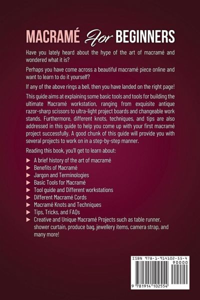 Have you lately heard about the hype of the art of macrame and wondered what it is? Perhaps you have come across a beautiful macrame piece online and want to learn to do it yourself? If any of the above rings a bell, then you have landed on the right page! Macrame is the craft of tying knots with ropes to create wonders. This craft can be used to make plant hangers, jewelry, other personal objects and even curtains. Macramé has a long and illustrious history, as you'll learn in this guide. No one can pinpoint a date for sure as to when was the very first time a macrame artwork was created. The majority of people today, however, believe the method dates back to the civilizations of Assyrians and Babylonians. This guide will provide you with an insight into the brief history of macrame, emerging from ancient times to finding its home in the modern-day trends. It will also provide you with the several benefits that this art form has to offer, as well as the necessary terminology that you'll come to interact with time and again throughout working on your projects. This guide aims at explaining some basic tools and tools for building the ultimate Macrame workstation, ranging from exquisite antique razor-sharp scissors to ultra-light project boards and changeable work stands. Furthermore, different knots, techniques, and tips are also addressed in this guide to help you come up with your first macrame project successfully. Reading this book, you'll get to learn about: * A brief history of the art of macrame * Benefits of Macrame * Jargon and Terminologies * Basic Tools for Macrame * Tool guide and Different workstations * Different Macrame Cords * Macrame Knots and Techniques * Tips, Tricks, and FAQs * Creative and Unique Macrame Projects such as table runner, shower curtain, produce bag, jewelry items, camera strap, and many more! If you're a beginner who doesn't know where to start from, then this guide is a must-have for you. So, don't waste any more of your time deciding what to do as the solution is simple. Just scroll up and click on buy now to get your copy and get started!