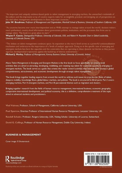 Introduction: Macro talent management in emerging and emergent markets: Foundations for a developing field Part I: Macro talent management in emerging markets 1. Macro talent management in Russia: Addressing entangled challenges in managing talent on the country level 2. Macro talent management in Poland: The role of talent and the challenges ahead 3. Macro talent management in China: Institutional, cultural ,and technological influences and employer strategy 4. Macro talent management in India: A contextual analysis of the challenges, opportunities and emerging patterns 5. Macro talent management in Argentina: Application of macro perspective in volatile environments Part II: Macro talent management in emergent markets 6. Macro talent management in Singapore: An analysis based on local media 7. Macro talent management in the United Arab Emirates: Developing more informative government perspectives Part III: Pan-national developments 8. Migration: Managing macro talent management at the country and city level 9. Clusters and talent management: Optimizing the potential of skilled mobility within spatial agglomerations