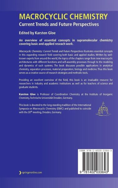 Macrocyclic Chemistry: Current Trends and Future Perspectives illustrates essential concepts in this expanding research field covering both basic and applied studies. Written by well-known experts from around the world, the topics of the chapters range from new macrocyclic architectures with different functions and self-assembly processes through to the modeling and dynamics of such systems. The content also reflects on application possibilities in analytical chemistry, separation processes, material preparation and medicine. Thus this book serves as a creative source of research strategies and methodic tools.