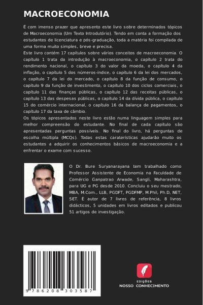É com imenso prazer que apresento este livro sobre determinados tópicos de Macroeconomia (Um Texto Introdutório). Tendo em conta a formação dos estudantes de licenciatura e pós-graduação, toda a matéria foi compilada de uma forma muito simples, breve e precisa. Este livro contém 17 capítulos sobre vários conceitos de macroeconomia. O capítulo 1 trata da introdução à macroeconomia, o capítulo 2 trata do rendimento nacional, o capítulo 3 do valor da moeda, o capítulo 4 da inflação, o capítulo 5 dos números-índice, o capítulo 6 da lei dos mercados, o capítulo 7 da lei do mercado, o capítulo 8 da função de consumo, o capítulo 9 da função de investimento, o capítulo 10 dos ciclos comerciais, o capítulo 11 das finanças públicas, o capítulo 12 das receitas públicas, o capítulo 13 das despesas públicas, o capítulo 14 da dívida pública, o capítulo 15 do comércio internacional, o capítulo 16 da balança de pagamentos, o capítulo 17 da taxa de câmbio. Os tópicos apresentados neste livro estão numa linguagem simples para melhor compreensão do estudante. No final de cada capítulo são apresentadas perguntas possíveis. No final do livro, há perguntas de escolha múltipla (MCQs). Todas estas caraterísticas ajudarão muito os estudantes a adquirir os conhecimentos básicos de macroeconomia e a enfrentar o exame com sucesso.