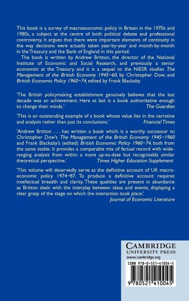 This book is a survey of macroeconomic policy in Britain in the 1970s and 1980s which argues that there were important elements of continuity in the way decisions were actually taken year-by-year and month-by-month in the Treasury and the Bank of England in this period. It is written by Andrew Britton, the director of the National Institute of Economic and Social Research, and previously a senior economist at the Treasury, and is a sequel to the NIESR studies by Christopher Dow (1945-60) and by Frank Blackaby and others (1960-74). Part One is a chronological account of policy actions and their setting. Part Two provides a history of ideas, describing the most influential writings of economists in Britain during this period, while Part Three looks at the influence of the world economy on Britain. Parts Four and Five include several elements of new statistical analysis concerning the way in which policy instruments were used, in particular the signals to which policymakers reacted when setting interest rates.