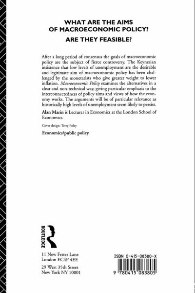 Macroeconomic Policy examines the central tenets of both Keynesian and Monetarist schools. It begins by examining the aims of macroeconomic policy: low unemployment, low inflation, high levels of output and high rates of growth. In practice these goals interact and policies which promote one are often detrimental to another. As well as examining how the different schools manage the trade-off between goals, the book also considers their distinctive attitude to markets, how they manage concepts of the short and long run and their different notions of uncertainty.