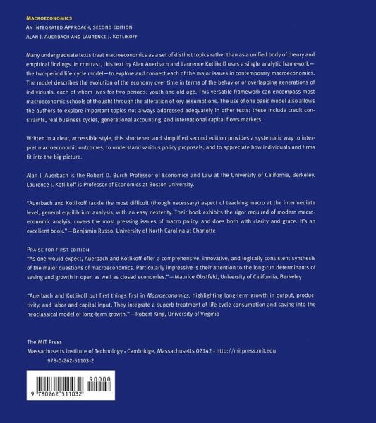 Many undergraduate texts treat macroeconomics as a set of distinct topics rather than as a unified body of theory and empirical findings. In contrast, this text by Alan Auerbach and Laurence Kotlikoff uses a single analytic framework—the two-period life-cycle model—to explore and connect each of the major issues in contemporary macroeconomics. The model describes the evolution of the economy over time in terms of the behavior of overlapping generations of individuals, each of whom lives for two periods: youth and old age. This versatile framework can encompass most macroeconomic schools of thought through the alteration of key assumptions. The use of one basic model also allows the authors to explore important topics not always addressed adequately in other texts; these include credit constraints, real business cycles, generational accounting, and international capital flows markets. Written in a clear, accessible style, this shortened and simplified second edition provides a systematic way to interpret macroeconomic outcomes, to understand various policy proposals, and to appreciate how individuals and firms fit into the big picture.