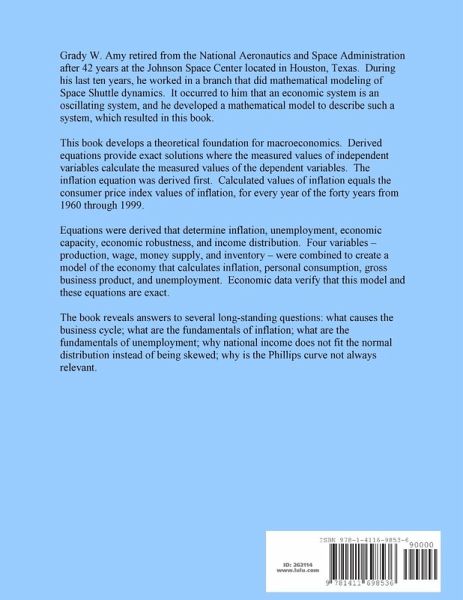 Click on "Preview" to display a three page description of the book and a preview of the entire book. This book derives theoretical equations for macroeconomics. The inflation equation was derived first. Calculated values of inflation equal the consumer price index values of inflation, for every year of the forty years from 1960 through 1999. Equations were derived that determine inflation, unemployment, economic capacity, economic robustness, and income distribution. Four variables--production, wage, money supply, and inventory--were used to create a model of the economy that calculates inflation, personal consumption, gross business product, and unemployment. Economic data verify that this model and these equations are exact. The book reveals answers to several long-standing questions: what causes the business cycle; why national income does not fit the normal distribution instead of being skewed; why is the Phillips curve not always relevant, etc.