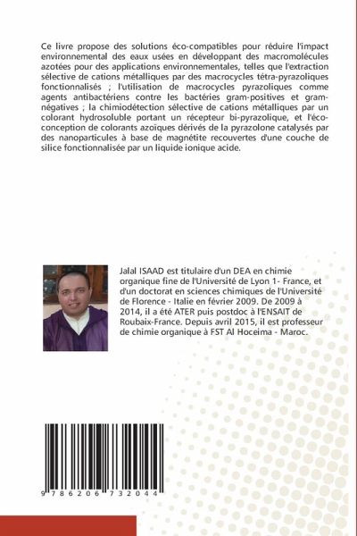 Ce livre propose des solutions éco-compatibles pour réduire l'impact environnemental des eaux usées en développant des macromolécules azotées pour des applications environnementales, telles que l'extraction sélective de cations métalliques par des macrocycles tétra-pyrazoliques fonctionnalisés ; l'utilisation de macrocycles pyrazoliques comme agents antibactériens contre les bactéries gram-positives et gram-négatives ; la chimiodétection sélective de cations métalliques par un colorant hydrosoluble portant un récepteur bi-pyrazolique, et l'éco-conception de colorants azoïques dérivés de la pyrazolone catalysés par des nanoparticules à base de magnétite recouvertes d'une couche de silice fonctionnalisée par un liquide ionique acide.