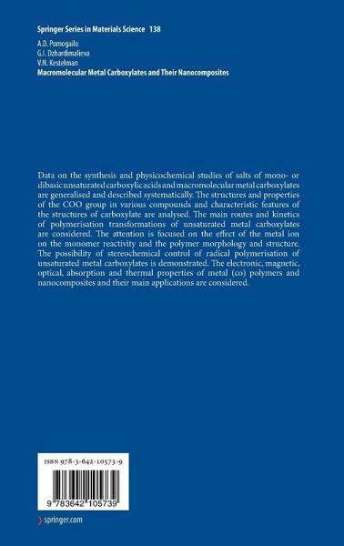Data on the synthesis and physicochemical studies of salts of mono- or dibasic unsaturated carboxylic acids and macromolecular metal carboxylates are generalised and described systematically in this monograph. The structures and properties of the COO group in various compounds and characteristic features of the structures of carboxylate are analysed. The main routes and kinetics of polymerisation transformations of unsaturated metal carboxylates are considered. The attention is focused on the effect of the metal ion on the monomer reactivity and the polymer morphology and structure. The possibility of stereochemical control of radical polymerisation of unsaturated metal carboxylates is demonstrated. The electronic, magnetic, optical, absorption and thermal properties of metal (co)polymers and nanocomposites and their main applications are also considered.