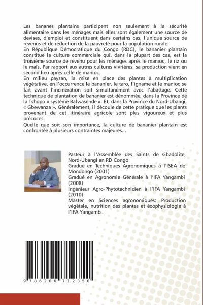 Les bananes plantains participent non seulement à la sécurité alimentaire dans les ménages mais elles sont également une source de devises, d'emploi et constituent dans certains cas, l'unique source de revenus et de réduction de la pauvreté pour la population rurale.En République Démocratique du Congo (RDC), le bananier plantain constitue la culture commerciale qui, dans la plupart des cas, est la troisième source de revenu pour les ménages après le manioc, le riz ou le maïs. Par rapport aux autres cultures vivrières, sa production vient en second lieu après celle de manioc.En milieu paysan, la mise en place des plantes à multiplication végétative, en l'occurrence le bananier, le taro, l'igname et le manioc se fait avant l'incinération soit simultanément avec l'abattage. Cette technique de plantation de bananier est dénommée, dans la Province de la Tshopo ' système Bafwasende '. Et, dans la Province du Nord-Ubangi, ' Gbewanza '. Généralement, il découle de cette pratique que les plants provenant de cet itinéraire agricole sont plus vigoureux et plus précoces.Quelle que soit son importance, la culture de bananier plantain est confrontée à plusieurs contraintes majeures...
