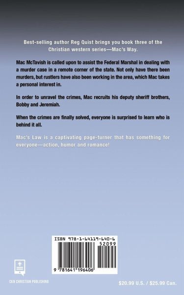 Best-selling author Reg Quist brings you book three of the Christian western series – Mac’s Way. Mac McTavish is called upon to assist the Federal Marshal in dealing with a murder case in a remote corner of the state. Not only have there been murders, but rustlers have also been working in the area, which Mac takes a personal interest in. In order to unravel the crimes, Mac recruits his deputy sheriff brothers, Bobby and Jeremiah. When the crimes are finally solved, everyone is surprised to learn who is behind it all. Mac’s Law is a captivating page-turner that has something for everyone – action, humor and romance!