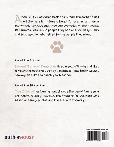 A beautifully illustrated book about Mac, the author's dog and the people, nature's beautiful scenes and large man-made vehicles that they see everyday on their walks. Dad waves hello to the people they see on their daily walks and Mac usually gets petted by the people they meet.