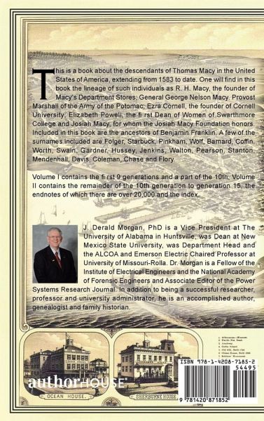 This is a book about the descendants of Thomas Macy in the United States of America, extending from 1583 to date. One will find in this book the lineage of such individuals as R. H. Macy, the founder of Macy''s Department Stores; General George Nelson Macy. Provost Marshall of the Army of the Potomac; Ezra Cornell, the founder of Cornell University; Elizabeth Powell, the first Dean of Women of Swarthmore College and Josiah Macy, for whom the Josiah Macy Foundation honors. Included in this book are the ancestors of Benjamin Franklin. A few of the surnames included are Folger, Starbuck, Pinkham, Wolf, Barnard, Coffin, Worth, Swain, Gardner, Hussey, Jenkins, Walton, Pearson, Stanton, Mendenhall, Davis, Coleman, Chase and Flory. Volume I contains the first 9 generations and a part of the 10th, Volume II contains the remainder of the 10th generation to generation 15, the endnotes of which there are over 20,000 and the index.