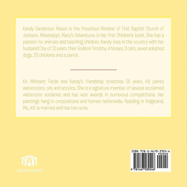 Macy's Adventures in the Dark is an illustration of how you can't judge someone by their outward appearance or by the handicaps they have on the outside. We adopted Macy at 8 months of age from our veterinarian after she was left by the breeder when he realized she was blind. Macy left home one night and was gone for over two weeks. We continued to pray for her to return home worried each day about what was happening to her. We realized that her blindness could only cause her more hardship. However, when we were called by a friend that she had been spotted after two weeks, we were amazed how far she had wondered off. She was in good condition other than her scarred up face from running into briars in the woods and a little underweight. We pondered the events that she may have faced along the way. The characters are illustrations of light that touch our lives along the dark path of life. Each character is based on the personalities of our family members. A funny and delightful story for children yet enlightening for adults on how you can return from the wrong turns you take in life if you pray and trust in God and seek advice from the good people that God has put in your path.
