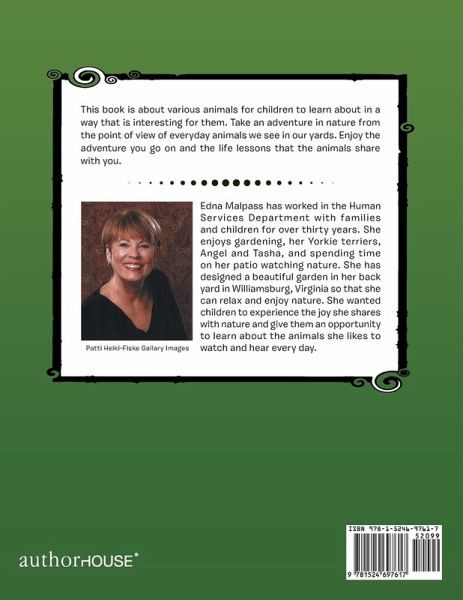 This book is about various animals for children to learn about in a way that is interesting for them. Take an adventure in nature from the point of view of everyday animals we see in our yards. Enjoy the adventure you go on and the life lessons that the animals share with you.