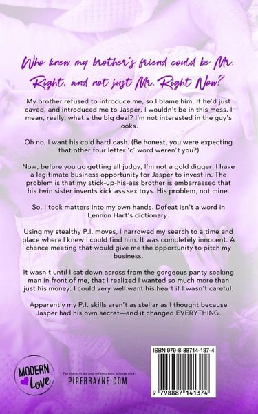 From two USA TODAY BESTSELLING authors comes a BROTHER'S BEST FRIEND SEXY ROMCOM STANDALONE. Who knew my brother's friend could be Mr. Right, and not just Mr. Right Now? My brother refused to introduce me, so I blame him. If he'd just caved, and introduced me to Jasper, I wouldn't be in this mess. I mean, really, what's the big deal? I'm not interested in the guy's looks. Oh no, I want his cold hard cash. (Be honest, you were expecting that other four letter 'c' word weren't you?) Now, before you go getting all judgy, I'm not a gold digger. I have a legitimate business opportunity for Jasper to invest in. The problem is that my stick-up-his-ass brother is embarrassed that his twin sister invents kick ass sex toys. His problem, not mine. So, I took matters into my own hands. Defeat isn't a word in Lennon Hart's dictionary. Using my stealthy P.I. moves, I narrowed my search to a time and place where I knew I could find him. It was completely innocent. A chance meeting that would give me the opportunity to pitch my business. It wasn't until I sat down across from the gorgeous panty soaking man in front of me, that I realized I wanted so much more than just his money. I could very well want his heart if I wasn't careful. Apparently my P.I. skills aren't as stellar as I thought because Jasper had his own secret-and it changed EVERYTHING. ** Note: This book was previous titled "The Banker". Same great story with a fresh new look.**