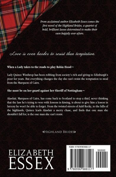 WHEN A LADY TAKES TO THE ROADS TO PLAY ROBIN HOODLady Quince Winthrop has been robbing from society's rich and giving to Edinburgh's poor for years. But everything changes the day she can't resist the temptation to steal from the Marquess of Cairn.SHE MUST BE ON HER GUARD AGAINST HER SHERIFF OF NOTTINGHAMAlasdair, Marquess of Cairn, has come back to Scotland to stop a thief, never thinking that the lass he's trying to woo is about to give him a lesson in larceny he won't be able to forget. From the twisted streets of Auld Reeky, to the hills of the highlands, Quince leads Alasdair on a merry chase, and finds that the one man she can't fall for is the one man she can't resist.